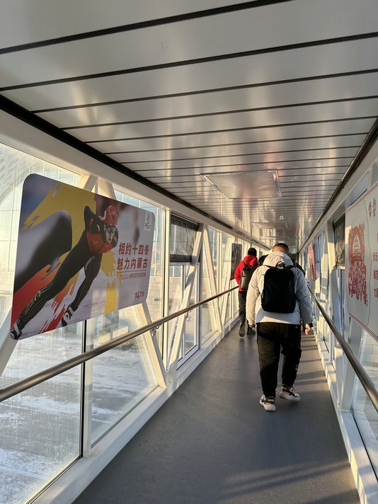 當(dāng)記者一出機(jī)艙,一股寒流瞬間襲來,又瞬間被機(jī)場(chǎng)廊道、候機(jī)區(qū)、旅客出口區(qū)域滿滿的“十四冬”氛圍以及志愿者的迎接暖了心。