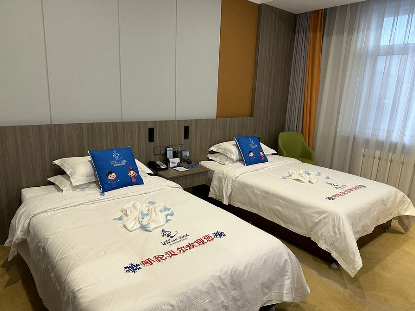 當(dāng)記者走進(jìn)酒店房間時(shí),“十四冬”的吉祥物抱枕擺在床頭,床上用毛巾和花朵擺的雪花造型以及“呼倫貝爾歡迎您”的暖心話語,瞬間趕走一路疲憊。