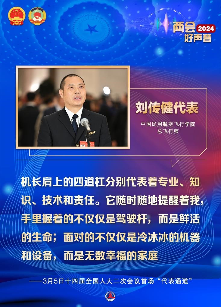 劉傳健說:“機(jī)長肩上的四道杠分別代表著專業(yè)、知識(shí)、技術(shù)和責(zé)任。它隨時(shí)隨地提醒著我,手里握著的不僅僅是駕駛桿,而是鮮活的生命;面對(duì)的不僅僅是冷冰冰的機(jī)器和設(shè)備,而是無數(shù)幸福的家庭?!?/p>