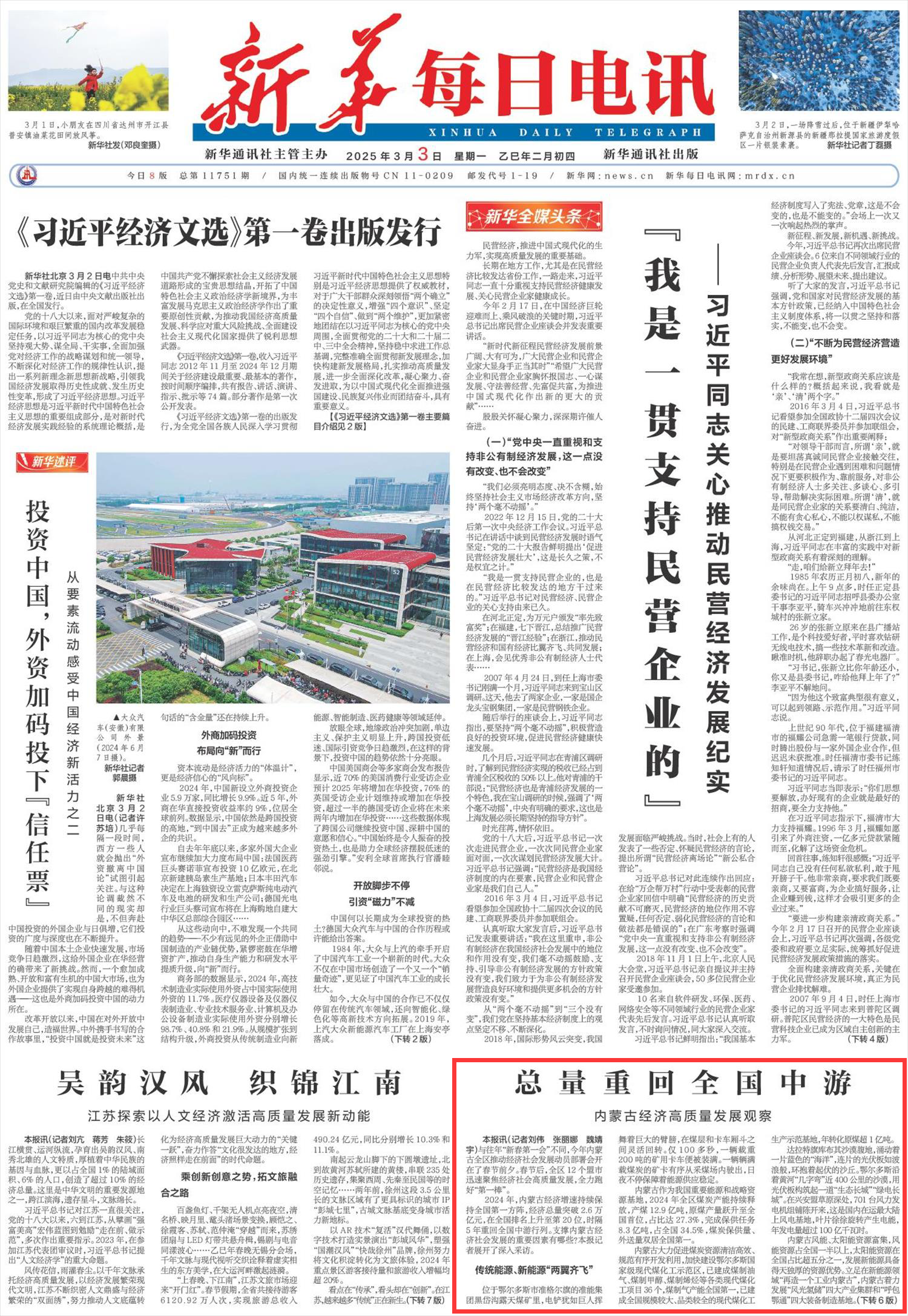 2025年3月3日,《新華每日電訊》第1版刊發(fā)題為《總量重回全國中游 內(nèi)蒙古經(jīng)濟高質(zhì)量發(fā)展觀察》的文章,報道了與往年“新春第一會”不同,今年內(nèi)蒙古全區(qū)推動經(jīng)濟社會發(fā)展動員部署會開在了春節(jié)前夕。春節(jié)后,全區(qū)12個盟市迅速聚焦經(jīng)濟社會高質(zhì)量發(fā)展,全力跑好“第一棒”。2024年,內(nèi)蒙古經(jīng)濟增速持續(xù)保持全國第一方陣,經(jīng)濟總量突破2.6萬億元,在全國排名上升至第20位,時隔5年重回全國中游行列。