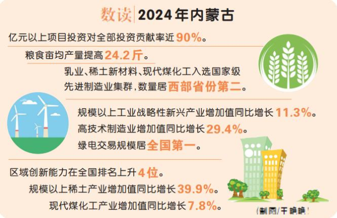 新賽道上,受益于高質(zhì)量重大項(xiàng)目帶動(dòng),2024年,自治區(qū)綠電交易規(guī)模居全國第一;“蒙科聚”平臺(tái)技術(shù)合同成交額同比增長33.6%,全區(qū)凈增科技型中小企業(yè)853家、高新技術(shù)企業(yè)97家、科技領(lǐng)軍企業(yè)20家,乳業(yè)、稀土、氫、儲(chǔ)等領(lǐng)域取得一批填補(bǔ)行業(yè)空白的技術(shù)突破,我區(qū)區(qū)域創(chuàng)新能力在全國排名上升4位;全區(qū)規(guī)模以上新能源及相關(guān)產(chǎn)業(yè)增加值同比增長20.1%,規(guī)模以上工業(yè)戰(zhàn)略性新興產(chǎn)業(yè)增加值同比增長11.3%,高技術(shù)制造業(yè)增加值同比增長29.4%……推動(dòng)新興產(chǎn)業(yè)“強(qiáng)筋壯骨”、未來產(chǎn)業(yè)加速培育,內(nèi)蒙古落子如飛!