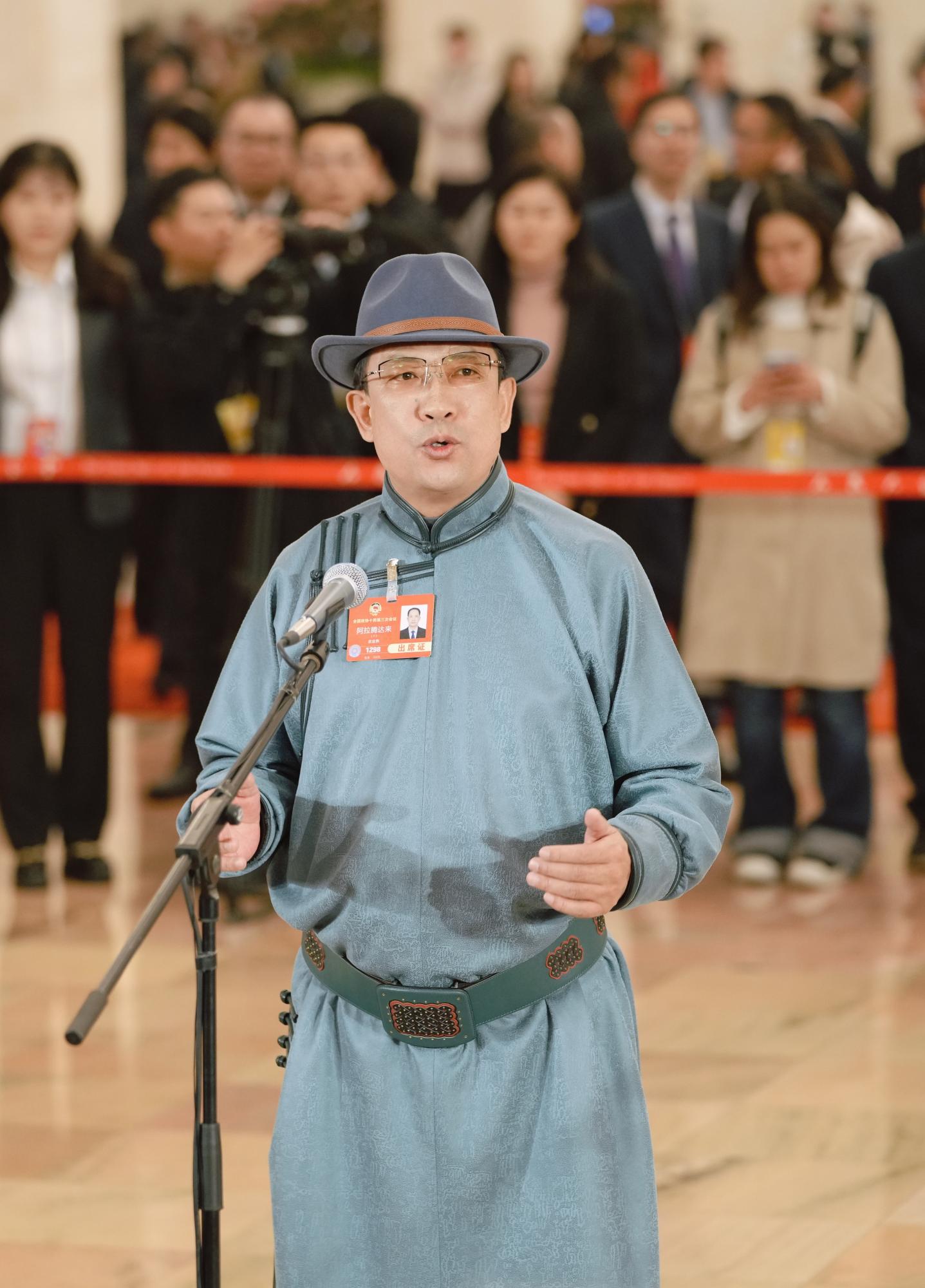 3月10日,全國政協(xié)十四屆三次會議第三場“委員通道”集體采訪活動在北京人民大會堂舉行。住內(nèi)蒙古全國政協(xié)委員阿拉騰達(dá)來接受媒體采訪。草原云記者 王鵬 攝