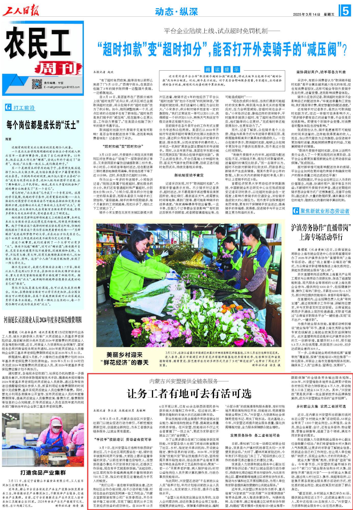 2025年3月14日《工人日?qǐng)?bào)》第5版刊發(fā)了《內(nèi)蒙古興安盟提供全鏈條服務(wù)——讓務(wù)工者有地可去有活可選》的文章,報(bào)道了今年2月—3月,內(nèi)蒙古自治區(qū)興安盟人社部門以就業(yè)促進(jìn)行動(dòng)為牽引,不斷挖掘發(fā)展新空間,創(chuàng)造就業(yè)新崗位,為務(wù)工者提供全鏈條服務(wù),讓就業(yè)更有溫度。