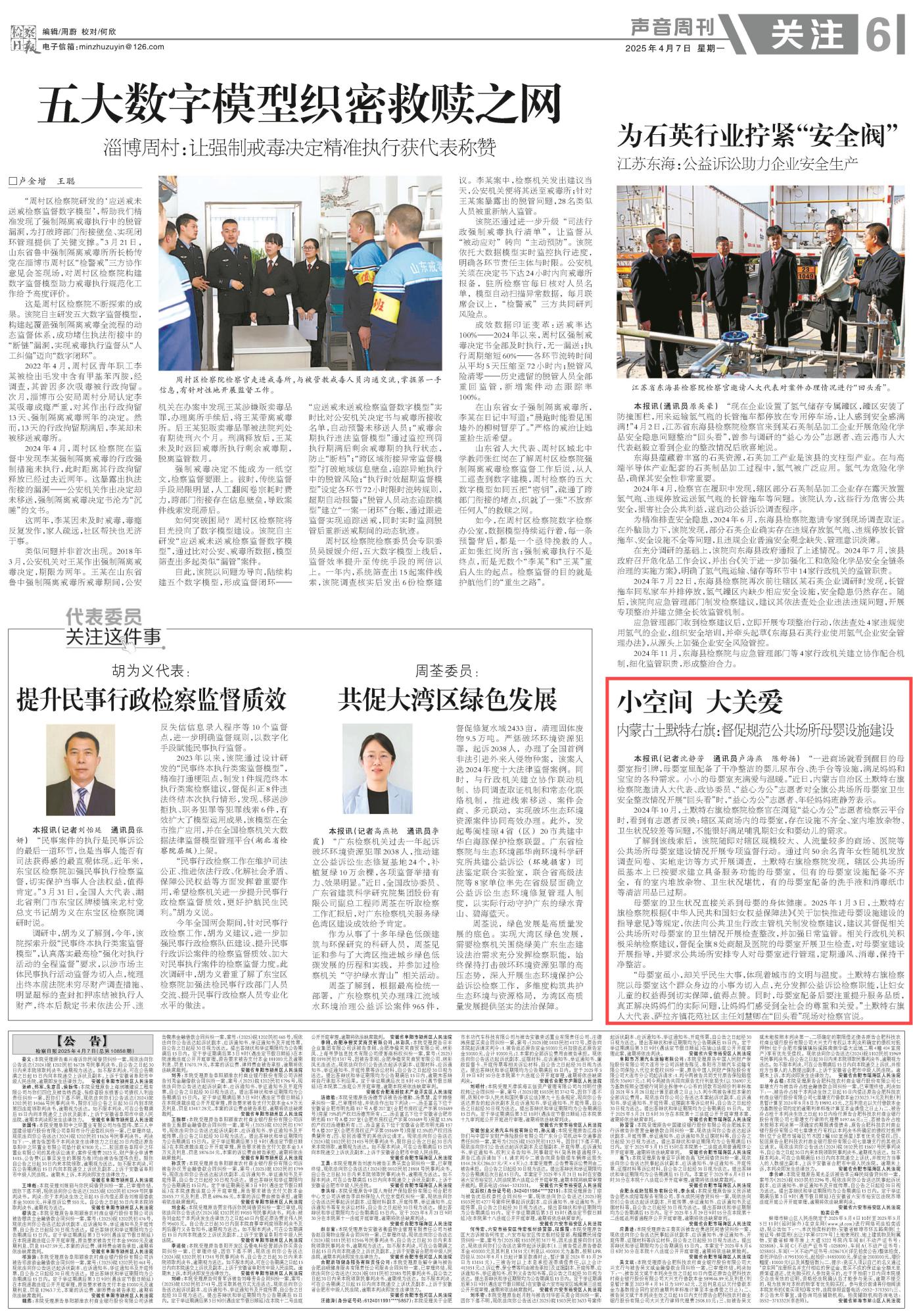 2025年4月7日,《檢察日報》第6版刊發(fā)題為《內(nèi)蒙古土默特右旗:督促規(guī)范公共場所母嬰設(shè)施建設(shè)》的文章,報道了內(nèi)蒙古自治區(qū)土默特右旗檢察院以母嬰室這個群眾身邊的小事為切入點,充分發(fā)揮公益訴訟檢察職能,讓婦女兒童的權(quán)益得到切實保障,讓媽媽們感受到全社會的尊重和關(guān)愛。