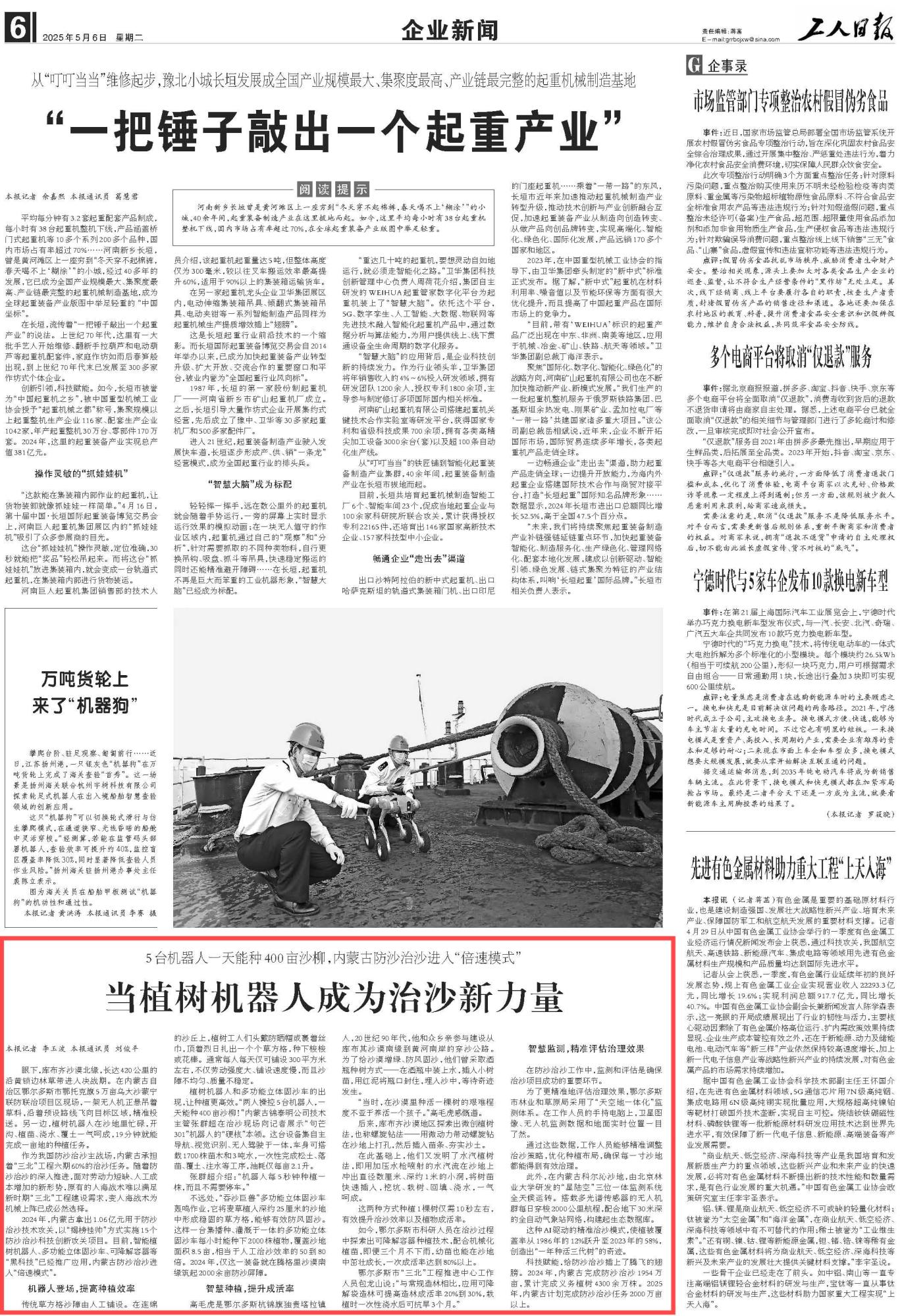 2025年5月6日,《工人日報》第6版刊發(fā)題為《當(dāng)植樹機器人成為治沙新力量》的文章,報道了內(nèi)蒙古作為我國防沙治沙主戰(zhàn)場,承擔(dān)著“三北”工程六期60%的治沙任務(wù)。隨著防沙治沙的深入推進,智能植樹機器人、多功能立體固沙車、可降解容器等“黑科技”已經(jīng)推廣應(yīng)用,內(nèi)蒙古防沙治沙進入“倍速模式”。