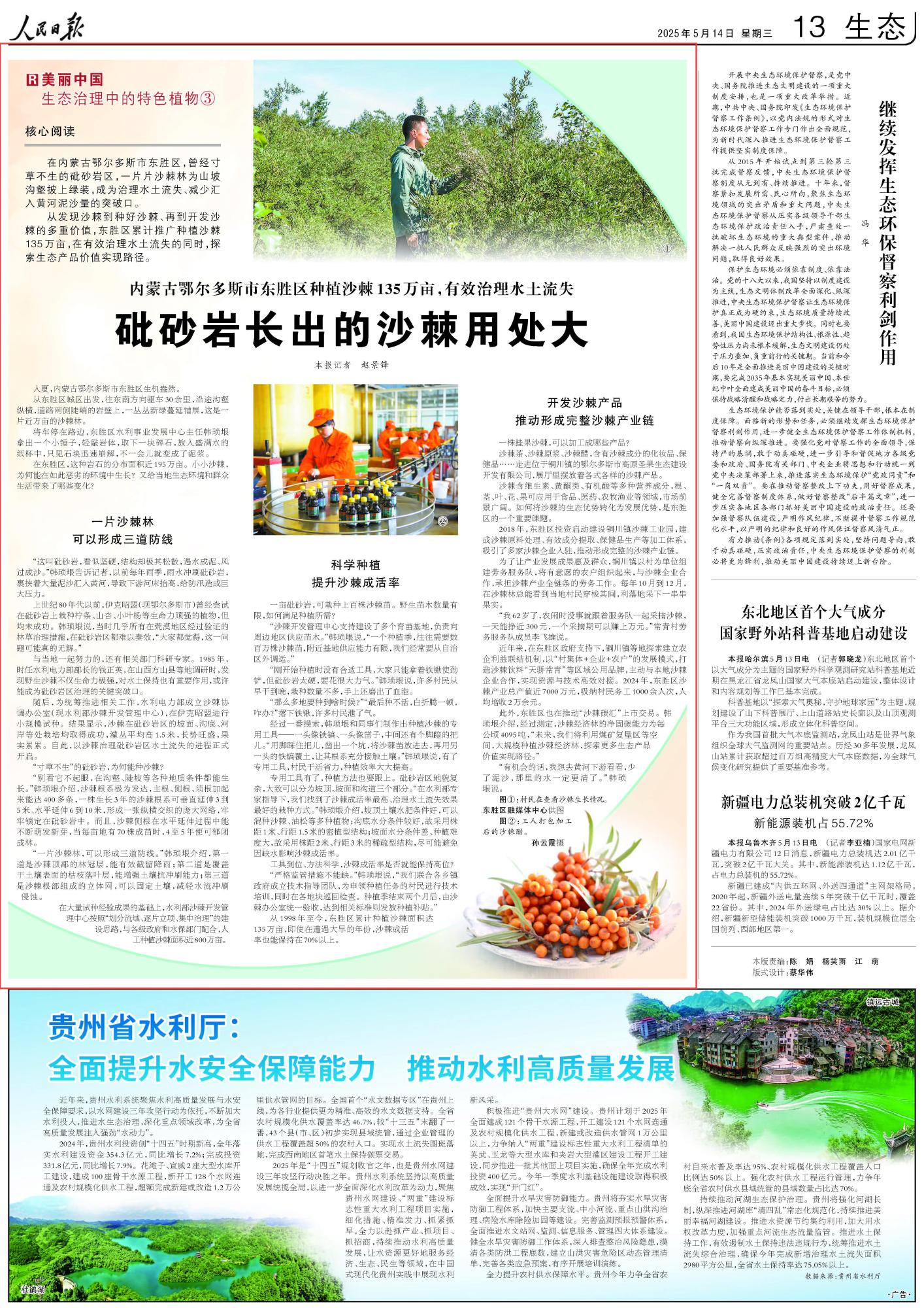 2025年5月14日《人民日報(bào)》第13版刊發(fā)了《內(nèi)蒙古鄂爾多斯市東勝區(qū)種植沙棘135萬畝,有效治理水土流失 砒砂巖長出的沙棘用處大》的文章,報(bào)道了內(nèi)蒙古鄂爾多斯市東勝區(qū)累計(jì)推廣種植沙棘135萬畝,在有效治理水土流失的同時(shí),探索生態(tài)產(chǎn)品價(jià)值實(shí)現(xiàn)路徑。