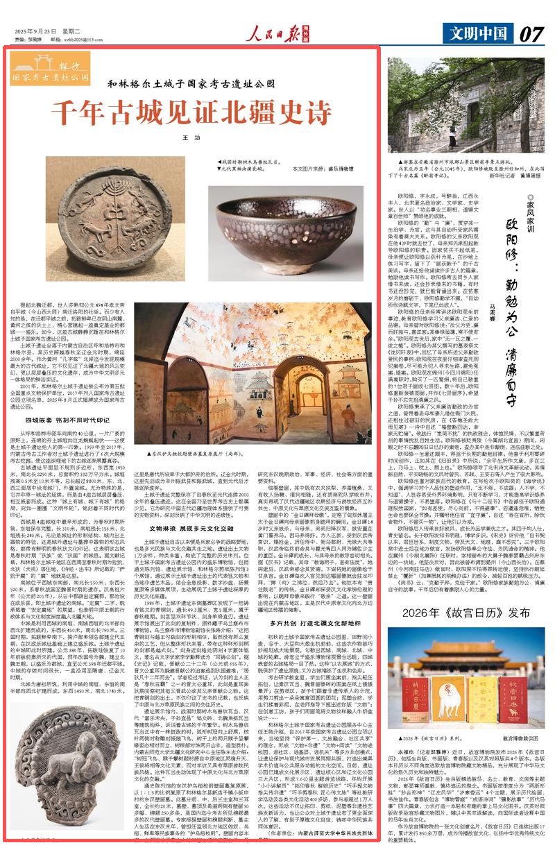 2025年9月23日,《人民日報(bào)海外版》第7版刊發(fā)題為《和林格爾土城子國家考古遺址公園千年古城見證北疆史詩(探訪國家考古遺址公園)》的文章,報(bào)道了土城子遺址坐落于內(nèi)蒙古自治區(qū)呼和浩特市和林格爾縣,其歷史跨越春秋至遼金元時(shí)期,綿延2000余年。