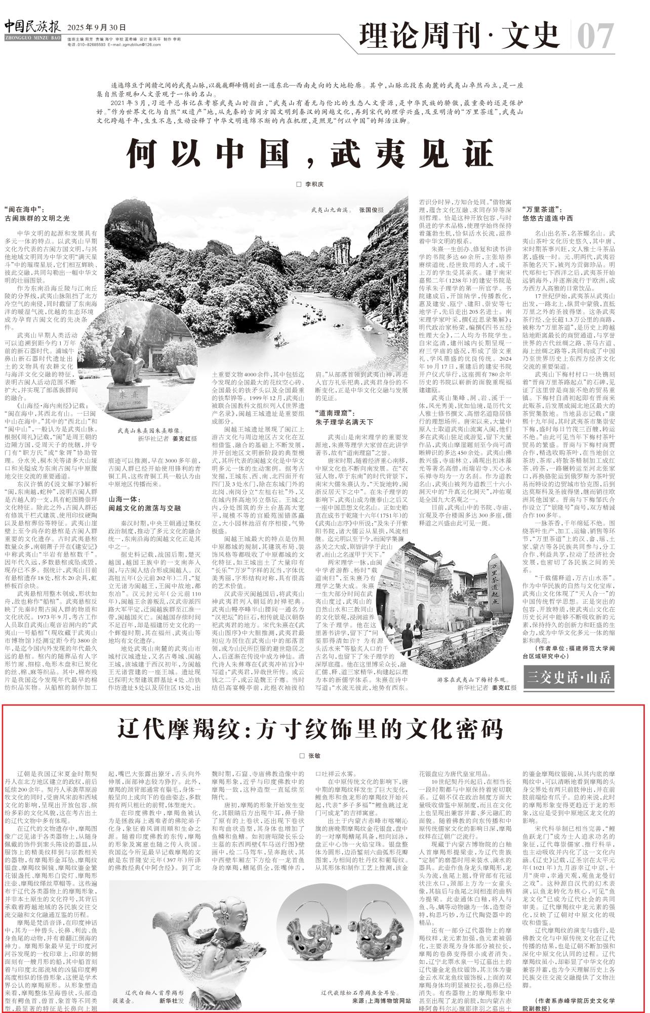 2025年9月30日,《中國民族報》第7版刊發(fā)題為《遼代摩羯紋:方寸紋飾里的文化密碼》的文章,報道了遼代摩羯紋的演變與盛行,是佛教文化與中原傳統(tǒng)文化在遼代傳播的結果,也是遼朝不斷加強和深化中原文化認同的過程。遼代摩羯紋雖小,卻彰顯了中華文化的兼容并蓄,也為今天理解歷史上各民族交往交流交融提供了文物注腳。
