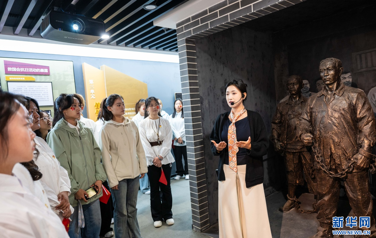 ??10月1日,內(nèi)蒙古師范大學(xué)馬克思主義學(xué)院的學(xué)子們?cè)诮椕筛鹘缈谷站葒?guó)會(huì)舊址紀(jì)念館參觀研學(xué)。新華網(wǎng)發(fā)(丁根厚 攝)