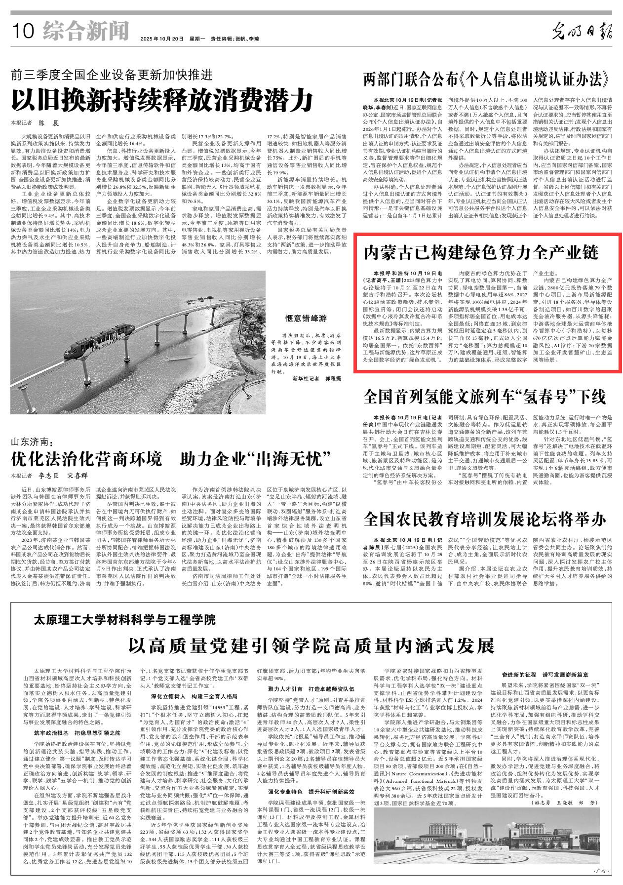 2025年10月20日《光明日報(bào)》第10版刊發(fā)了《內(nèi)蒙古已構(gòu)建綠色算力全產(chǎn)業(yè)鏈》的文章,報(bào)道了2025綠色算力中心論壇將于10月21至22日在內(nèi)蒙古呼和浩特召開。最新數(shù)據(jù)顯示,內(nèi)蒙古算力規(guī)模達(dá)16.5萬P、智算規(guī)模15.4萬P,均居全國第一。依托“東數(shù)西算”工程與新能源優(yōu)勢,這片草原正成為全國數(shù)字經(jīng)濟(jì)的“綠色發(fā)動(dòng)機(jī)”。