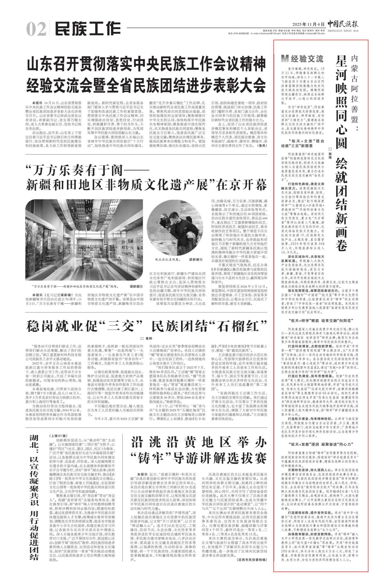 2025年11月4日,《中國民族報》第2版刊發(fā)題為《內(nèi)蒙古阿拉善盟:星河映照同心圓 繪就團結(jié)新畫卷》的文章,報道了伴隨著各族群眾的歡呼吶喊,神舟二十一號載人飛船在位于內(nèi)蒙古自治區(qū)阿拉善盟額濟納旗境內(nèi)的東風航天城成功發(fā)射。璀璨烈焰照亮北疆夜空,映照出各族群眾手拉手、心連心的團結(jié)身影。