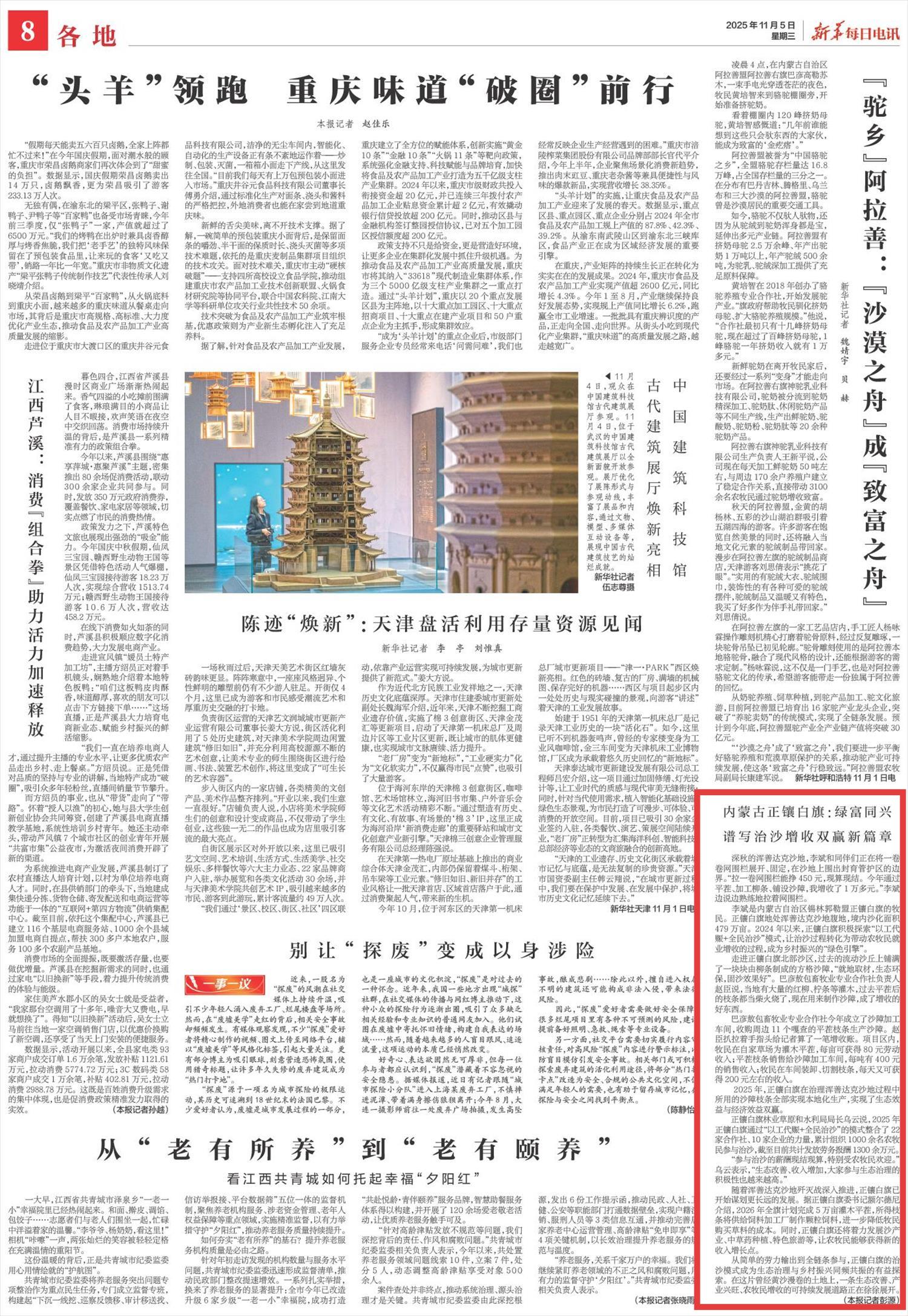 2025年11月5日,《新華每日電訊》第8版刊發(fā)題為《內(nèi)蒙古正鑲白旗:綠富同興譜寫治沙增收雙贏新篇章》的文章,報道了2024年以來,內(nèi)蒙古正鑲白旗積極探索“以工代賑+全民治沙”模式,讓治沙過程轉(zhuǎn)化為帶動農(nóng)牧民就業(yè)增收的過程,成為鄉(xiāng)村振興的“綠色引擎”。