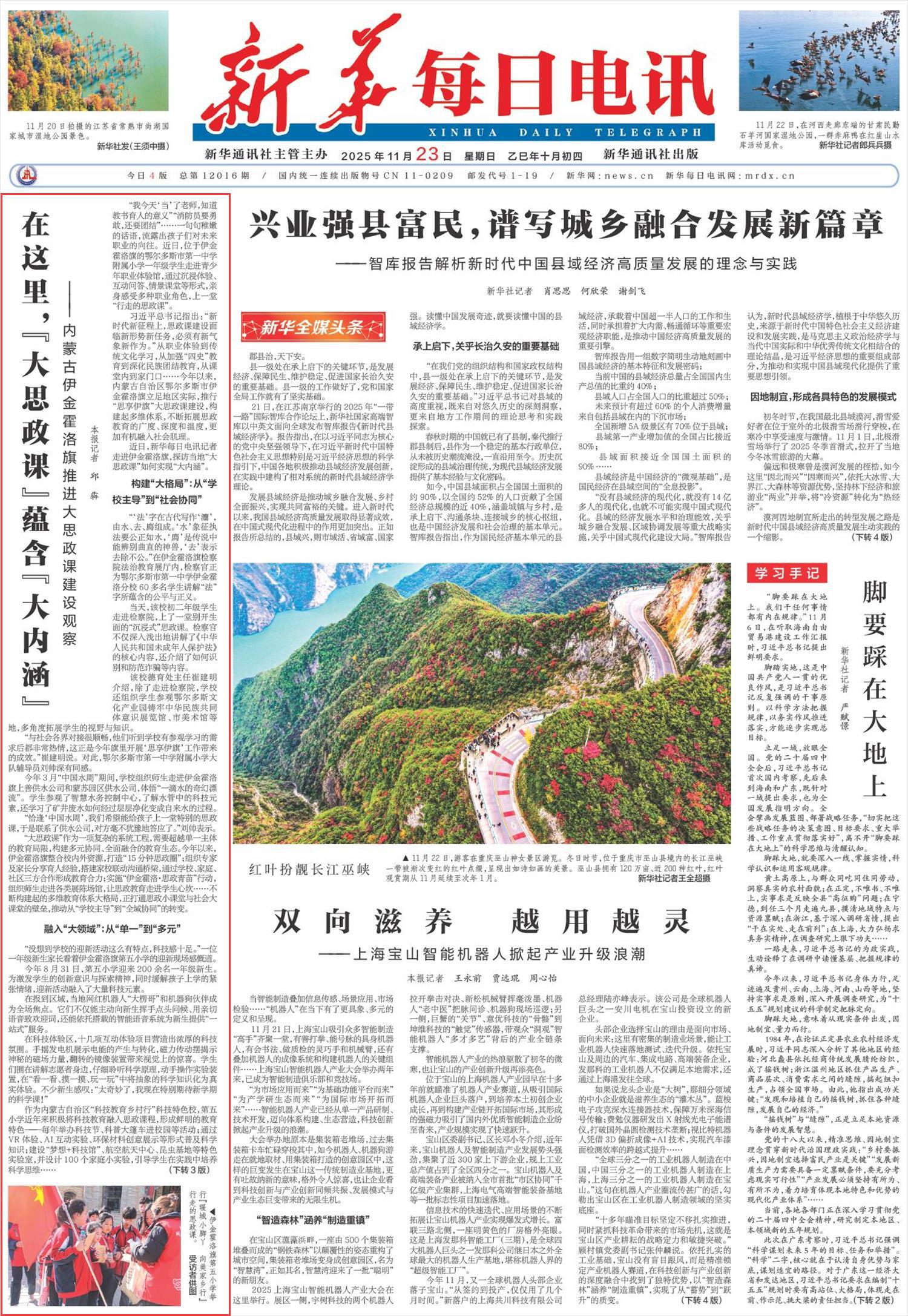 2025年11月23日,《新華每日電訊》頭版刊發(fā)題為《在這里,“大思政課”蘊(yùn)含“大內(nèi)涵”——內(nèi)蒙古伊金霍洛旗推進(jìn)大思政課建設(shè)觀察》的文章,報(bào)道了內(nèi)蒙古自治區(qū)鄂爾多斯市伊金霍洛旗立足地區(qū)實(shí)際,推行“思享伊旗”大思政課建設(shè),構(gòu)建起多維體系,不斷拓展思政教育的廣度、深度和溫度,更加有機(jī)融入社會肌理。