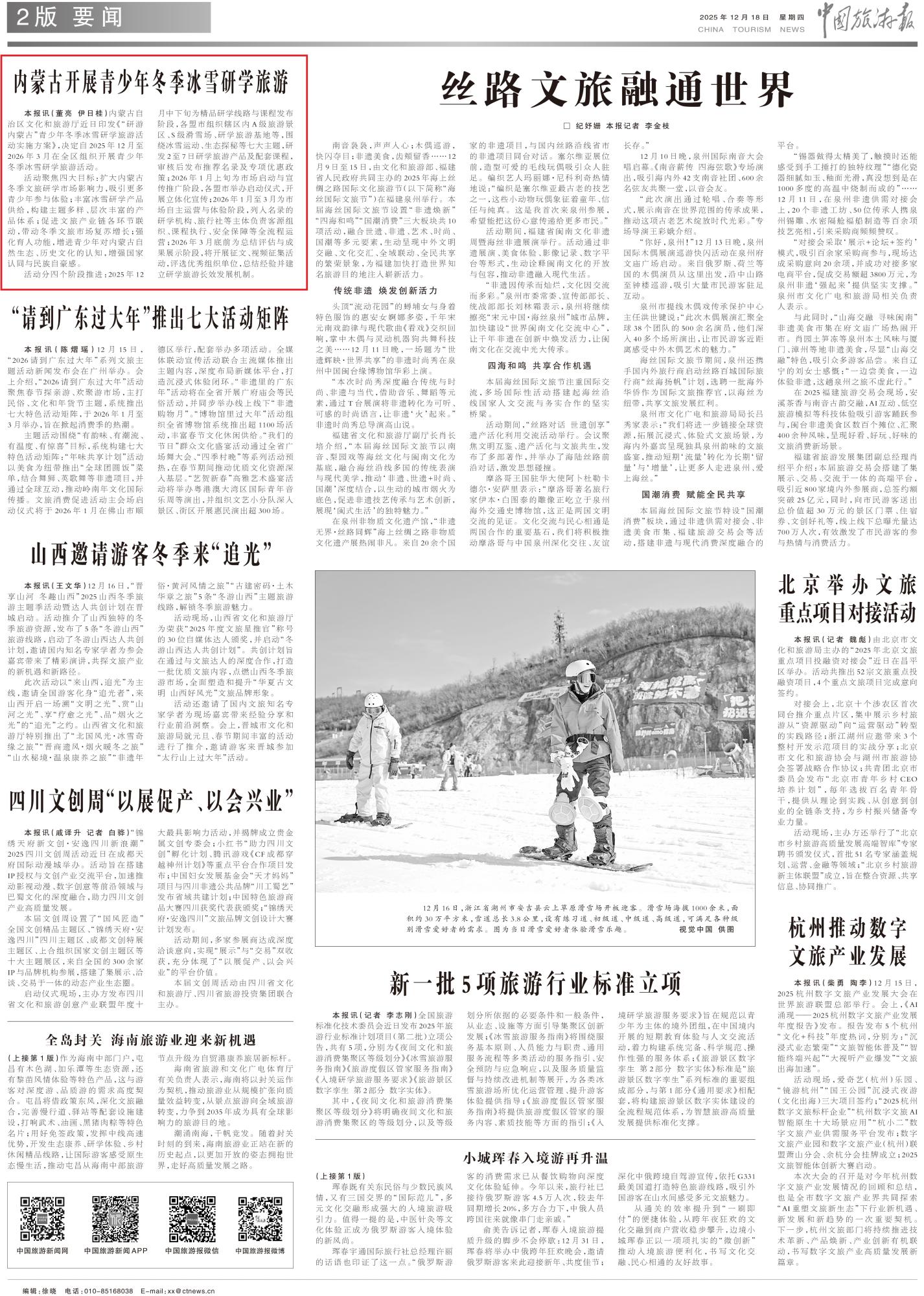 2025年12月18日《中國旅游報》第2版刊發(fā)了《內蒙古開展青少年冬季冰雪研學旅游》的文章,報道了內蒙古自治區(qū)文化和旅游廳近日印發(fā)《“研游內蒙古”青少年冬季冰雪研學旅游活動實施方案》,決定自2025年12月至2026年3月在全區(qū)組織開展青少年冬季冰雪研學旅游活動。