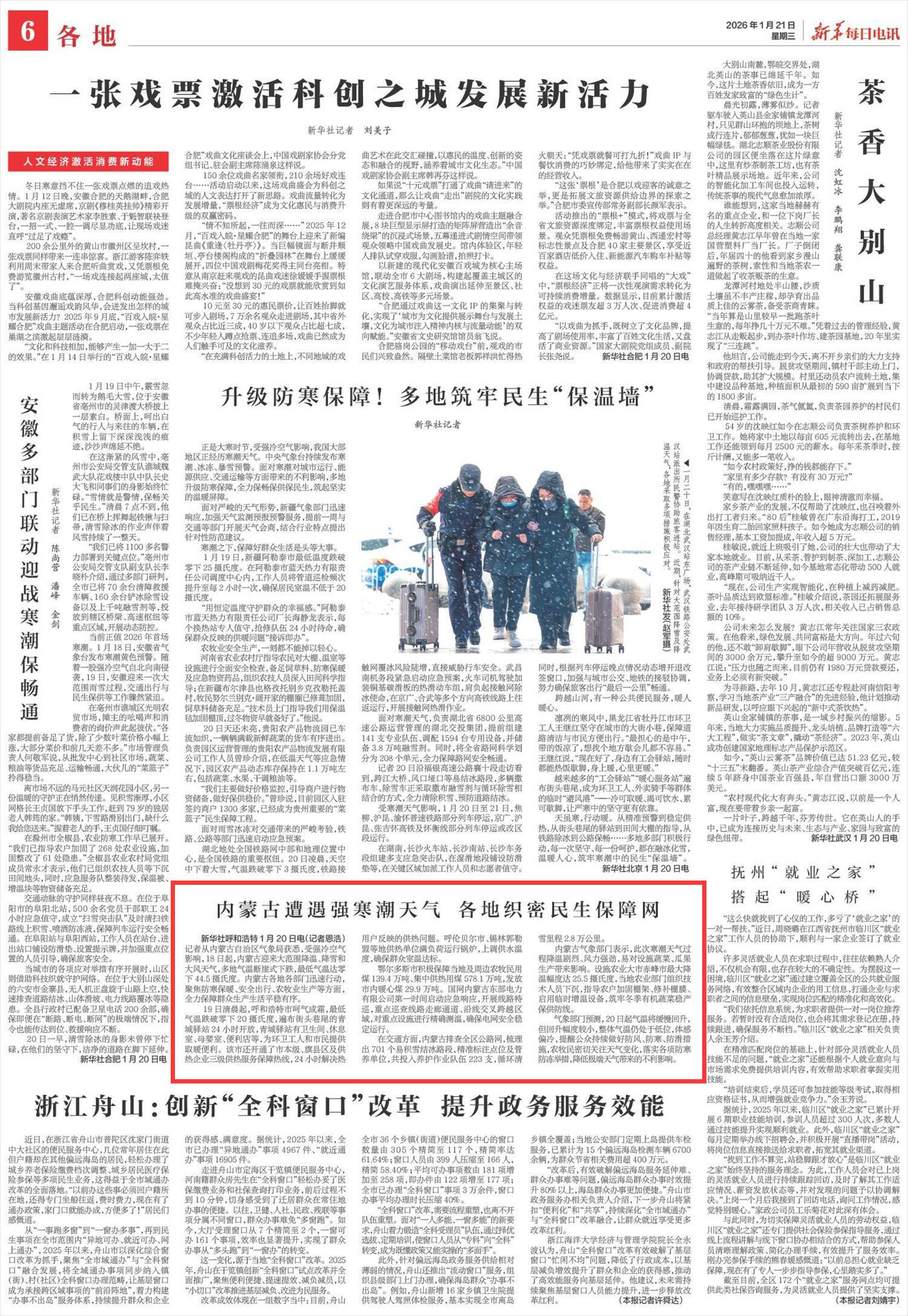 2026年1月21日《新華每日電訊》第6版刊發(fā)了《內(nèi)蒙古遭遇強寒潮天氣 各地織密民生保障網(wǎng)》的文章,報道了內(nèi)蒙古迎來大范圍降溫、降雪和大風天氣,多地氣溫斷崖式下跌,最低氣溫達零下44.5攝氏度。各地各部門迅速行動,聚焦防寒保暖、安全出行、農(nóng)牧業(yè)生產(chǎn)等方面,全力保障群眾生產(chǎn)生活平穩(wěn)有序。
