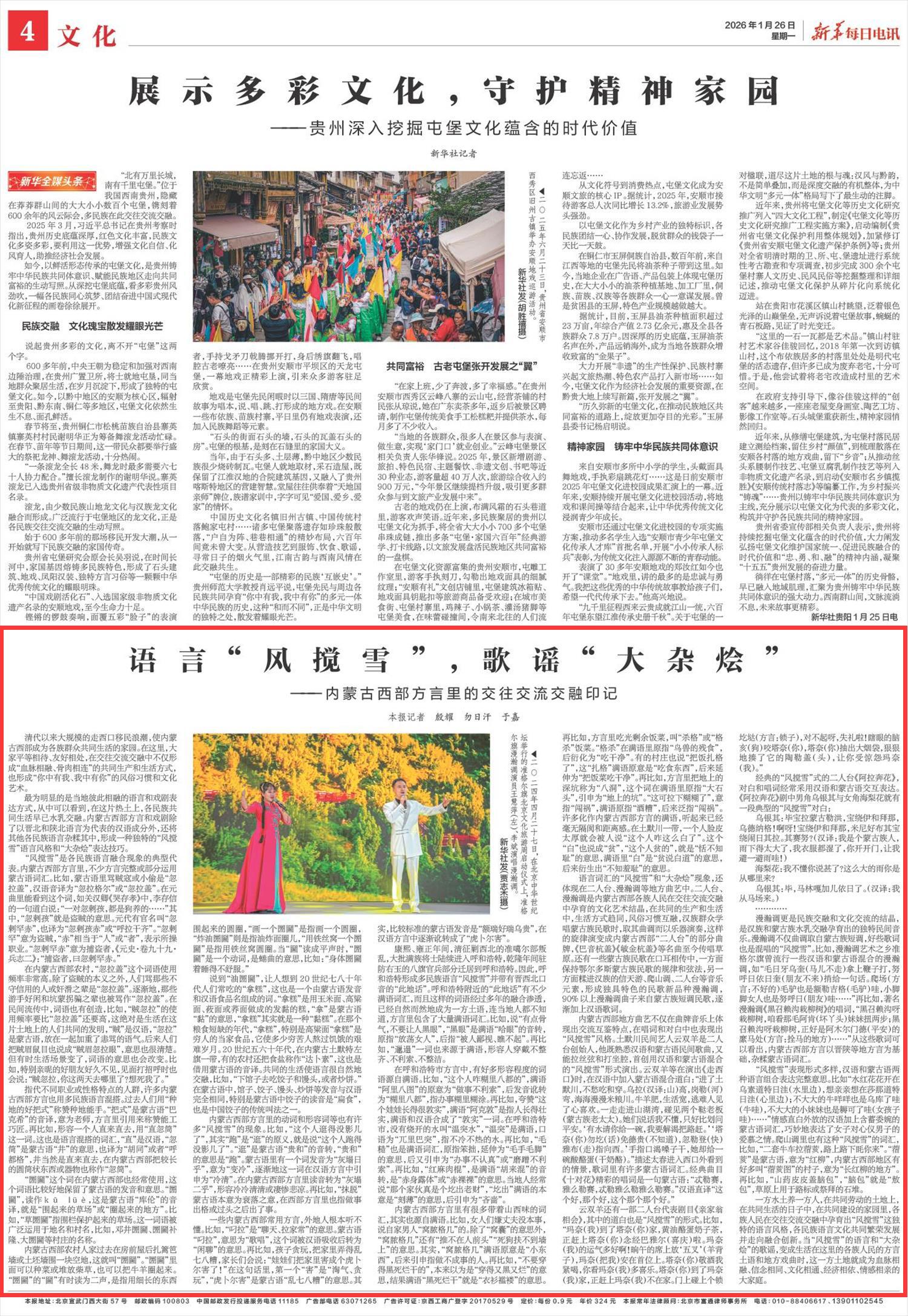 2026年1月26日《新華每日電訊》第4版刊發(fā)了《語言“風(fēng)攪雪”,歌謠“大雜燴”——內(nèi)蒙古西部方言里的交往交流交融印記》的文章,報(bào)道了內(nèi)蒙古西部方言和戲劇除了以晉北和陜北語言為代表的漢語成分外,還將其他各民族語言雜糅其中,形成一種獨(dú)特的“風(fēng)攪雪”語言風(fēng)格和“大雜燴”表達(dá)技巧。