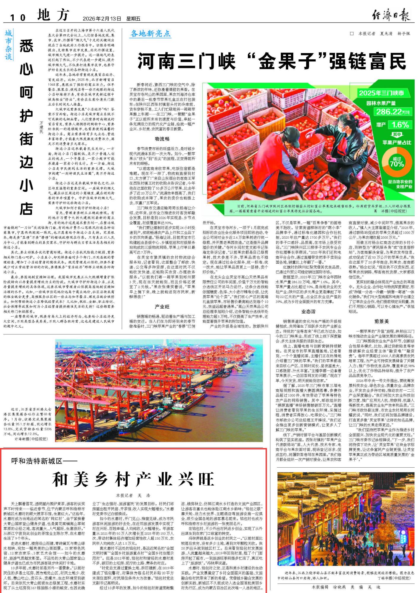 2026年2月13日《經(jīng)濟(jì)日?qǐng)?bào)》第10版刊發(fā)了《呼和浩特新城區(qū)——和美鄉(xiāng)村產(chǎn)業(yè)興旺》的文章,報(bào)道了內(nèi)蒙古呼和浩特市新城區(qū)水磨村、惱包村之變,是和美鄉(xiāng)村建設(shè)的生動(dòng)實(shí)踐。新城區(qū)成功入選全國首批美麗鄉(xiāng)村先行區(qū),成為內(nèi)蒙古自治區(qū)此次唯一入選的地區(qū)。產(chǎn)業(yè)發(fā)展奠定了鄉(xiāng)村全面振興的基礎(chǔ),文旅融合給村民帶來了新的希望。