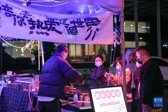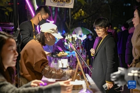 在四川省成都市錦江區(qū)三色路夜市,市民在購買小吃(2月28日攝)。