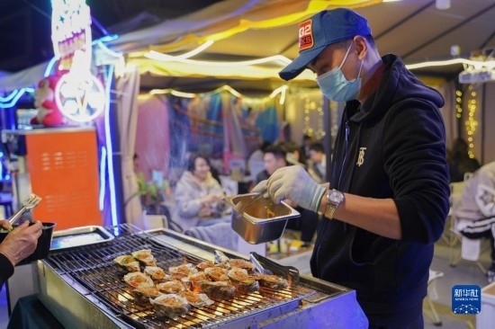 在四川省成都市錦江區(qū)三色路夜市,攤主在制作小吃(2月28日攝)。