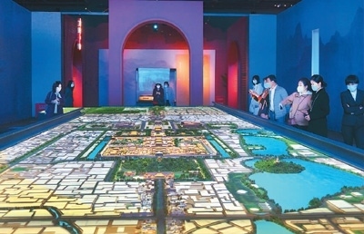 走進(jìn)“壯美中軸”展區(qū),一個(gè)16米長(zhǎng)的沙盤將北京中軸線沿線建筑全貌清晰呈現(xiàn)在眼前,帶給人強(qiáng)烈的視覺(jué)震撼。北起鐘鼓樓,南至永定門,北京中軸線全長(zhǎng)約7.8公里,是世界上現(xiàn)存最長(zhǎng)的城市中軸線。沙盤上的立體投影模擬出晝夜交替、四季輪轉(zhuǎn)的景象,讓人仿佛穿越時(shí)空,感受中軸線的歷史演變。沙盤兩側(cè)的電子屏滾動(dòng)播放著三維動(dòng)畫,立體展現(xiàn)故宮、天壇、景山等中軸線重要遺產(chǎn)點(diǎn)。