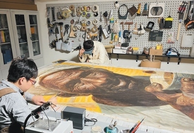 二〇二二年底,工作人員正在觀察油畫《父親》并準(zhǔn)備進行修復(fù)。 寇旭乾攝