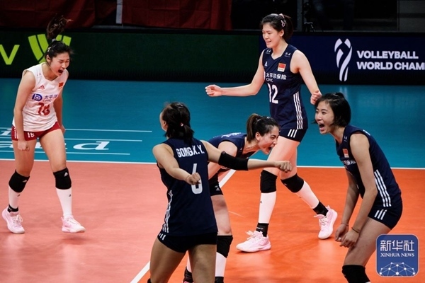 中國(guó)隊(duì)球員在比賽中慶祝得分。2022年9月28日,在荷蘭阿納姆舉行的2022世界女排錦標(biāo)賽第一階段D組小組賽中,中國(guó)隊(duì)3:0戰(zhàn)勝日本隊(duì)。新華社記者 孟鼎博 攝