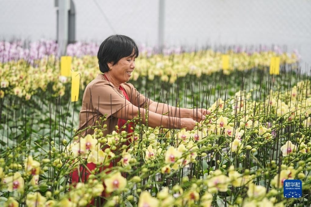 9月9日,農(nóng)戶在宿遷市王官集鎮(zhèn)蝴蝶蘭大世界大棚內(nèi)忙碌。