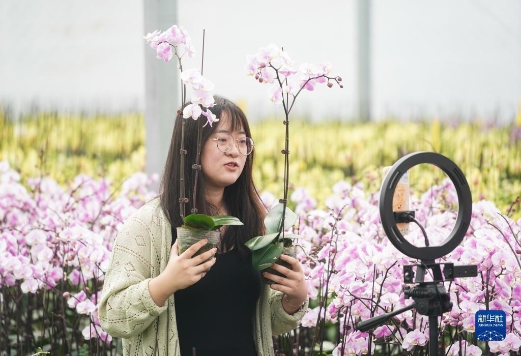 9月9日,工作人員在宿遷市王官集鎮(zhèn)蝴蝶蘭大世界大棚內(nèi)進(jìn)行網(wǎng)絡(luò)直播。
