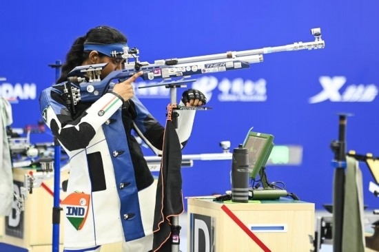 2023年7月29日,印度隊(duì)選手瓦拉里萬(wàn)以252.5環(huán)的總成績(jī)獲得第31屆世界大學(xué)生夏季運(yùn)動(dòng)會(huì)女子10米氣步槍冠軍。新華社記者 曹祎銘 攝