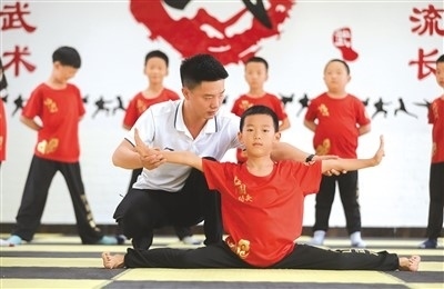 暑假期間,貴州省貴陽市開陽縣青少年學生校外活動中心免費開辦少兒武術(shù)班,吸引當?shù)貝酆梦湫g(shù)的孩子參加學習。圖為7月18日,在少兒武術(shù)班,孩子們在老師的指導下練習武術(shù)動作。袁福洪攝(人民圖片)