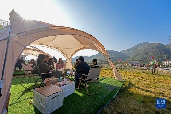 11月25日,在杭州市臨安區(qū)郎家村,游客在稻田文化節(jié)上體驗田園風(fēng)光。