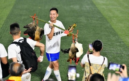 7月29日,忠誠村足球隊球員董永恒展示“村超”最佳射手獎品——榕江小香雞。新華社記者 楊文斌 攝