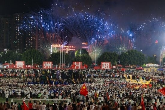 這是7月29日拍攝的“村超”比賽結束后的焰火表演。新華社記者 劉續(xù) 攝
