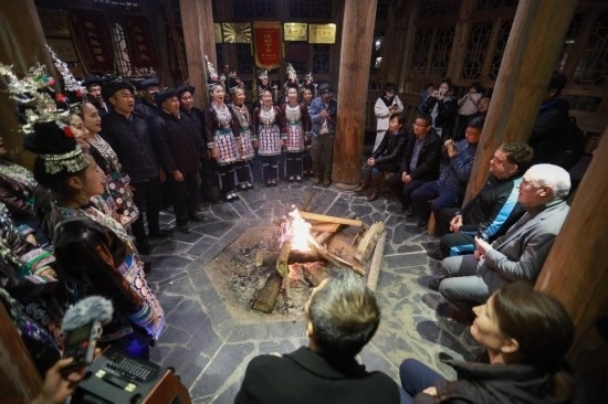 12月11日,榕江縣少數(shù)民族同胞用歌舞歡迎“學轉英超”培訓團隊。新華社記者 劉續(xù) 攝