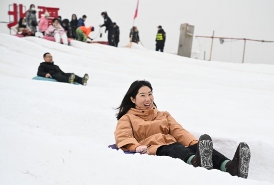 冬季的內(nèi)蒙古賽馬場變成了冰雪樂園,場地中間建起一座十幾米高的人造雪山,等著玩滑雪圈的人群從山頂一直排到山腳下,周圍還有冰上腳踏車、冰上陀螺等冰雪體驗設(shè)備。曹博雅坐著雪圈從山頂飛速滑下,又拉著爸爸坐上了旋轉(zhuǎn)小雪車。