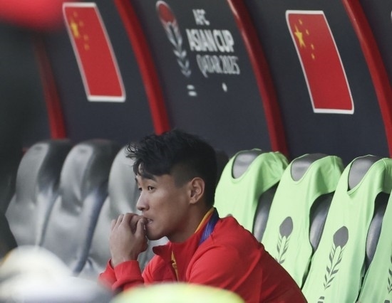 1月13日,中國隊對陣塔吉克斯坦隊,圖為因傷未能進(jìn)入名單的韋世豪賽前在替補(bǔ)席上。新華社記者 曹燦 攝
