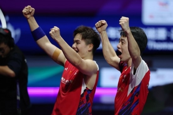 5月5日,中國隊組合梁偉鏗(左)/王昶在男子雙打比賽后慶祝勝利。新華社記者 陳斌 攝