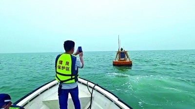 廣西合浦儒艮國家級自然保護(hù)區(qū)工作人員檢查海洋哺乳動(dòng)物水下聲學(xué)監(jiān)測浮標(biāo)。