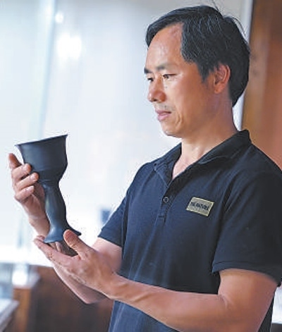 走進江西省靖安縣靖窯陶瓷展廳,古樸厚重的氣息撲面而來,展廳內(nèi)陳列著各式瓶、罐,通體墨黑,散發(fā)著厚重溫潤的光彩。記者小心地拿起一個蛋殼黑陶高柄杯掂了掂,杯子看起來重,實際卻輕如薄紙。