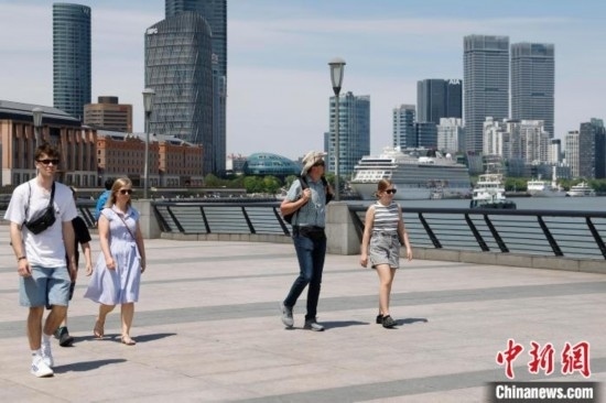 6月2日,外國游客在上海外灘濱江步道游覽。 中新社記者 殷立勤 攝