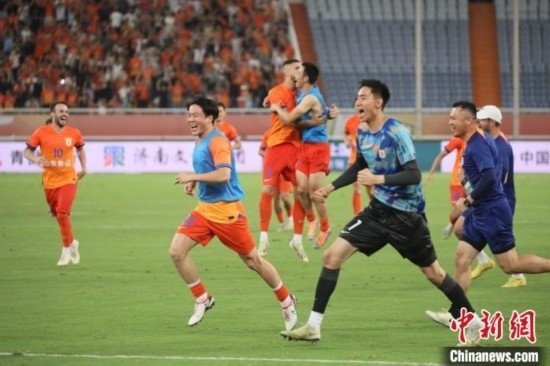 山東泰山隊(duì)點(diǎn)球大戰(zhàn)取勝,隊(duì)員沖進(jìn)場內(nèi)慶祝。中新社發(fā) 陳陽 攝