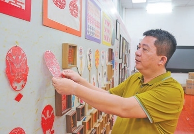 周繼川將學(xué)生的瓊劇剪紙作品張貼在展覽室。本報記者 曹文軒攝