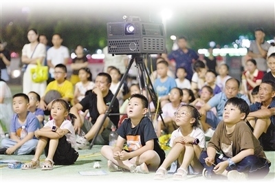 近日,在湖北省襄陽市保康縣體育場,孩子們在觀看電影。楊 韜攝(人民視覺)