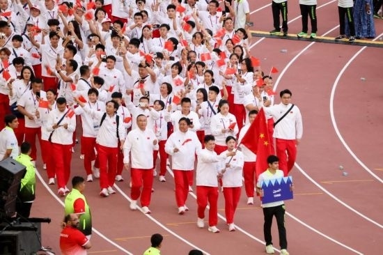 開幕式上,中國代表團第13個入場,旗手由乒乓球隊男子運動員李天陽和跆拳道隊女子運動員酈雨琪擔任。本屆運動會中國代表團共派出全國22個省區(qū)市的103名運動員參賽,其中女子運動員55人,男子運動員48人,將參加田徑、游泳、三對三籃球、沙灘排球、網(wǎng)球、跆拳道、國際象棋等17個大項、124個小項的比賽。