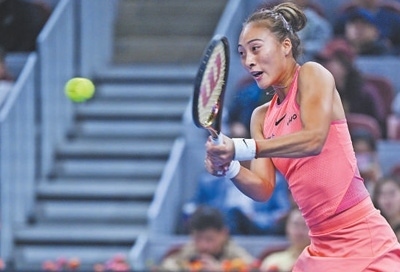 2024年中國網球公開賽女單1/4決賽,中國球員鄭欽文在比賽中回球。新華社記者 張 龍攝