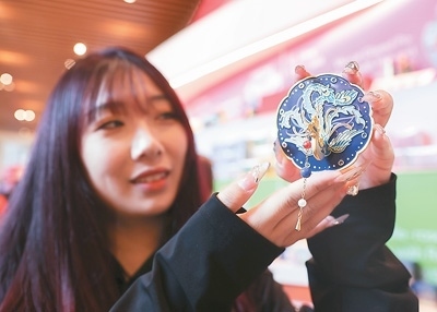 觀眾在中國國家博物館展示文創(chuàng)產(chǎn)品——鳳冠化妝鏡。陳曉根攝(人民視覺)
