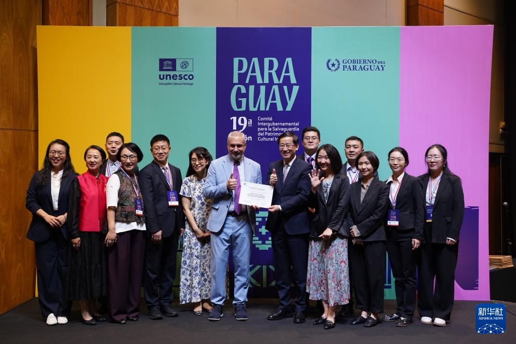 12月5日,在巴拉圭亞松森舉行的聯(lián)合國(guó)教科文組織保護(hù)非物質(zhì)文化遺產(chǎn)政府間委員會(huì)第19屆常會(huì)現(xiàn)場(chǎng),中國(guó)代表上臺(tái)領(lǐng)取證書。新華社記者 朱雨博 攝