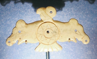 玉鷹是凌家灘文化最具代表性的器物之一。鷹側首傲視,雙翅張開,翅端各為一豬首形象,可能以豬作為財富的象征。鷹腹刻八角星紋,這種紋樣在凌家灘出土的玉版和新石器時代眾多陶器上都有出現(xiàn)。這件玉鷹可能是舉行祭祀儀式時所用之物,鷹、豬、八角星紋集于一器,體現(xiàn)了先民崇尚萬物有靈的宇宙觀。