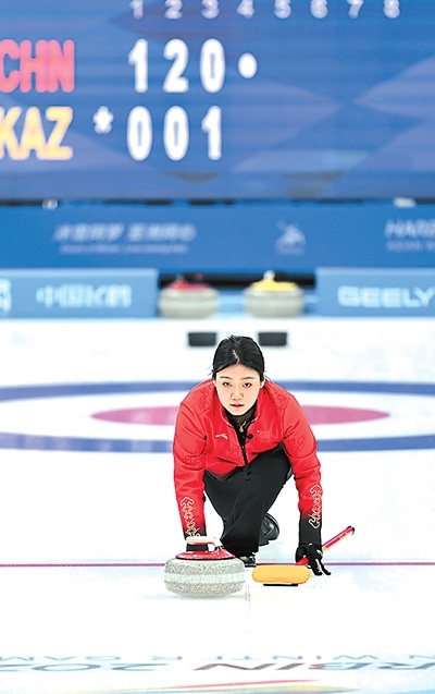 中國(guó)隊(duì)選手韓雨在亞冬會(huì)冰壺混雙比賽中擲壺。