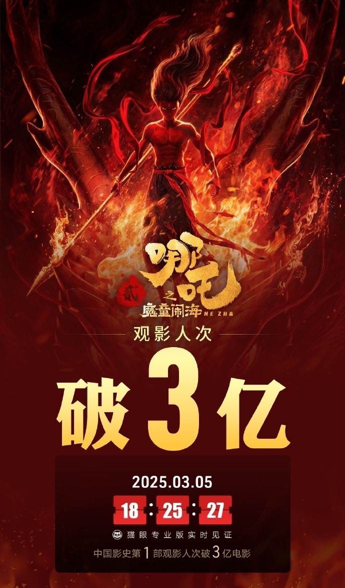 中國(guó)影史首部!《哪吒2》觀影人次破3億